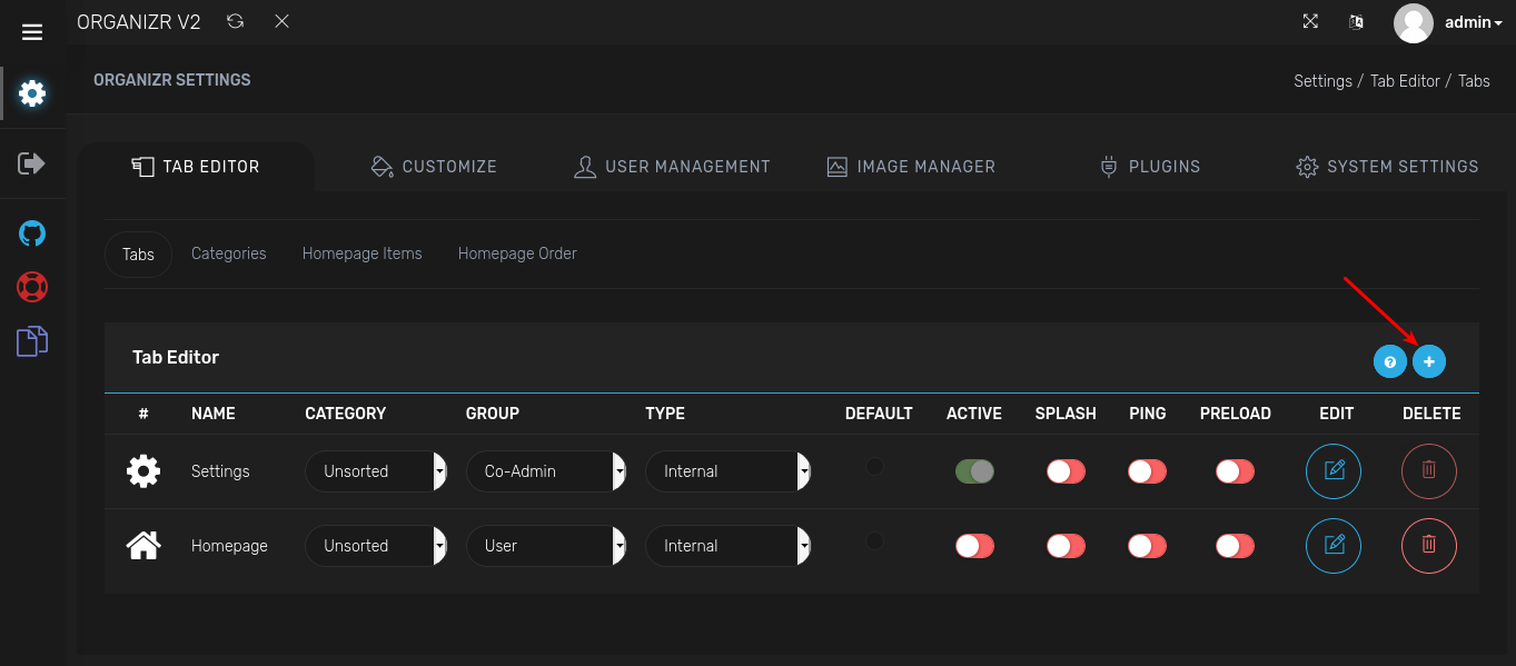 2. Things to note on this page, the Homepage is disabled by default and note the "Type" is set to "Internal". Your normal Apps with Saltbox will all need to have a Type: "iFrame" unless you have a particular app you wish to open in another window which is also a Type option. Go ahead and click "+ on the right". You will be prompted for information regarding the tab.