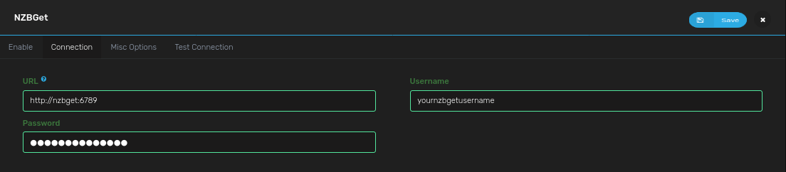 • For "Username" / "Password": fill in your NZBGet login (see [[NZBGet|Install: NZBGet#2-setup]])