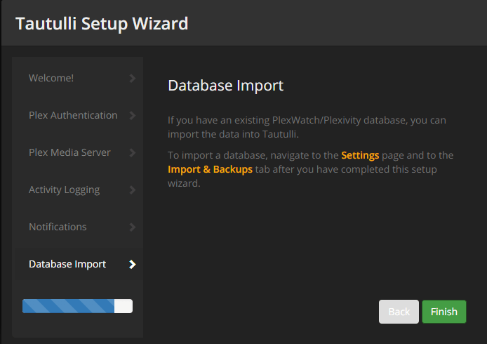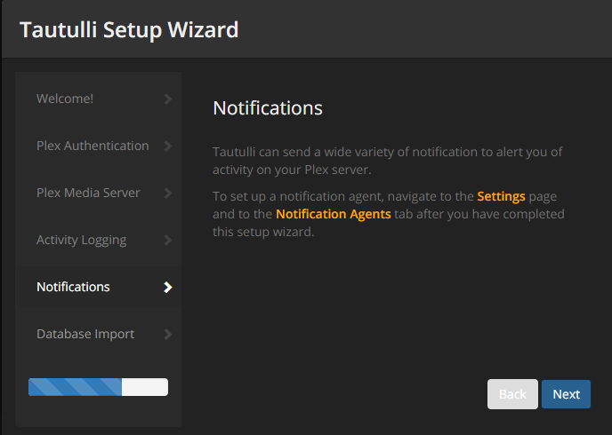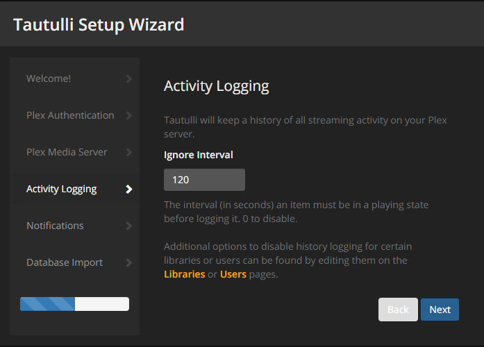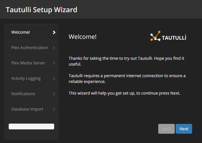 1. First time you go to the Tautulli site, you will be presented with the "Tautulli Setup Wizard". Click Next.